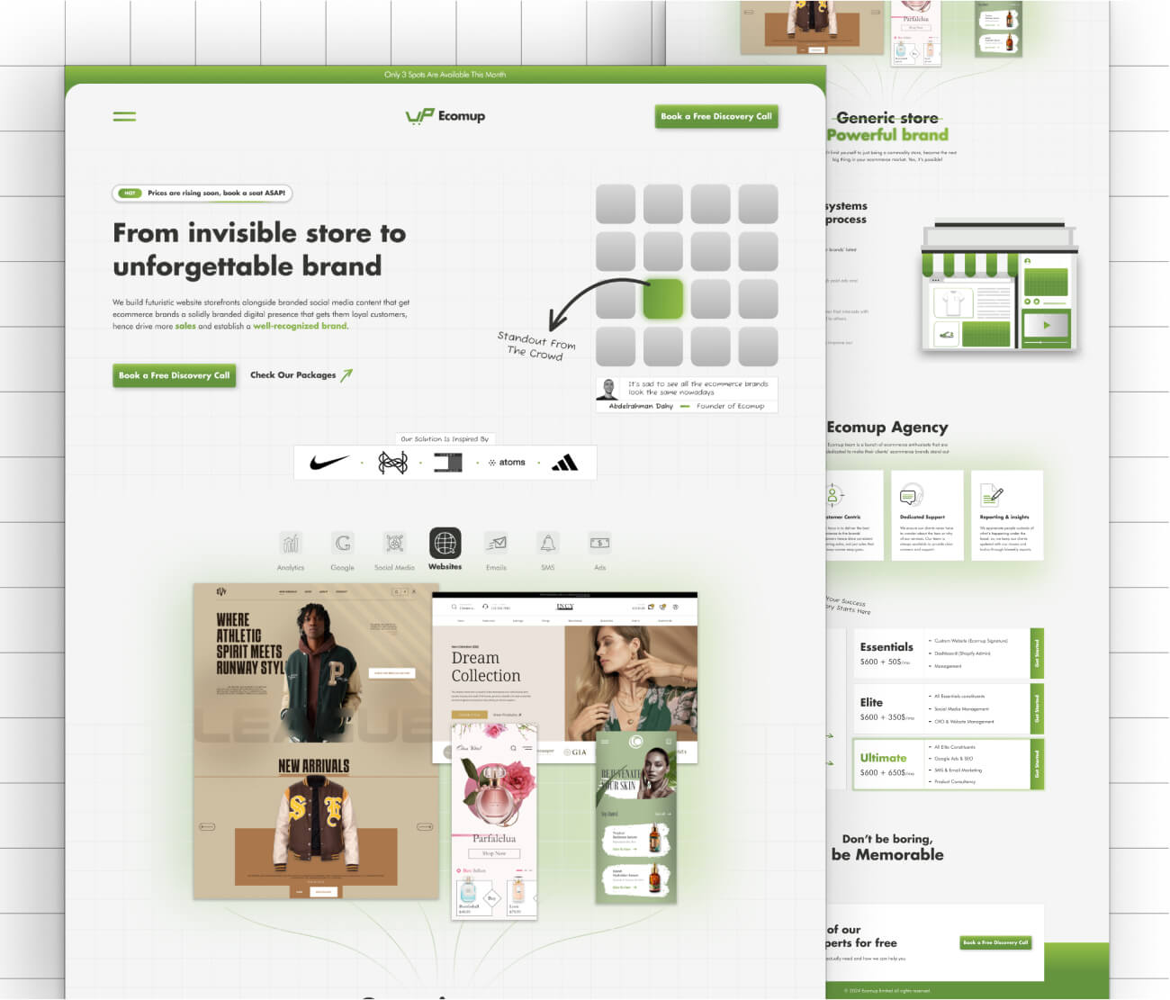 I crafted bold, direct messaging to reflect Ecomup’s core value—helping brands stand out. Headlines like "From invisible store to unforgettable brand," "Stand out from the crowd," and "Don’t be boring, be memorable" instantly communicate our mission: turning generic stores into powerful, unforgettable brands.
